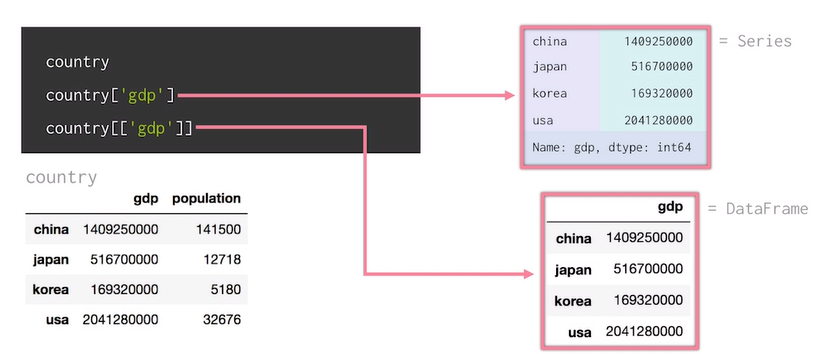 - Series만을 단독으로 생성하여 사용할 일은 없고, 행 단위/ 컬럼 단위로 접근 시 Series 자료구조 개념으로 접근한다