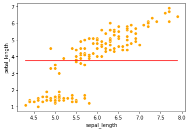 Q) 독립변수 sepal_length에 따른 종속변수 petal_length의 선형관계를 알고 싶다. 해당선형관계를 알아보기 위한 단순선형회귀모델 구축 전, baseline model을 활용하고자 한다. 이 때 baseline model을 시각화해보자