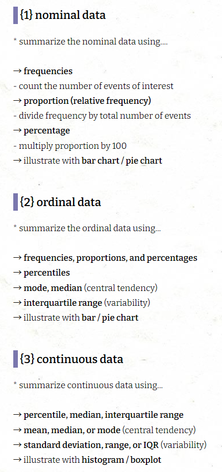 > 즉, data type을 자세히 위와 같이 4개의 type으로 나눌 수 있으며, categorical의 nominal & ordinal / 그리고 numerical의 continuous data의 경우 각각 어떤 형태로 descriptive statistics를 보여줄 수 있을 지도 배웠다.