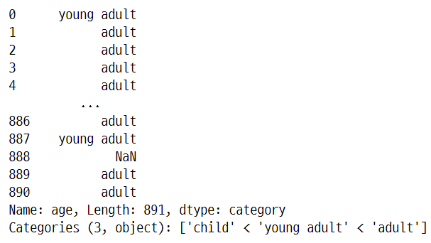 pd.cut(titanic.age, bins=[0,18,25,99], labels = ['child', 'young adult', 'adult'])